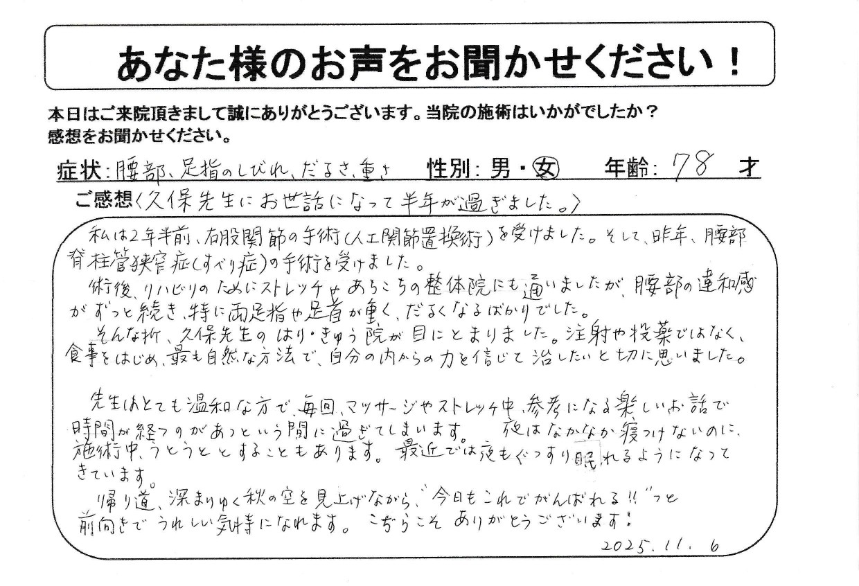 〈久保先生にお世話になって半年が過ぎました。〉 私は2年前、右股関節の手術(人工関節置換術)を受けました。そして、昨年、腰部脊柱管狭窄症(すべり症)の手術を受けました。 術後、リハビリのためにストレッチやあちこちの整体院にも通いましたが、腰部の違和感がずっと続き、特に両足指や足首が重くだるくなるばかりでした。 そんな折、久保先生のはり・きゅう院が目にとまりました。注射や投薬ではなく食事をはじめ最も自然な方法で自分の内からの力を信じて治したいと切に思いました。